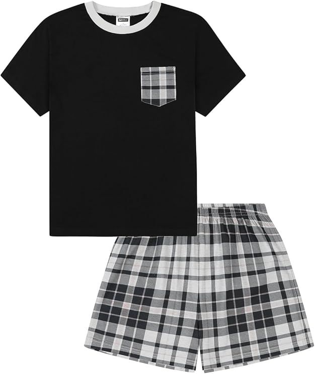 Girls Black and Grey Tartan Check Short Pyjama Set – 100% Cotton Sleepwear